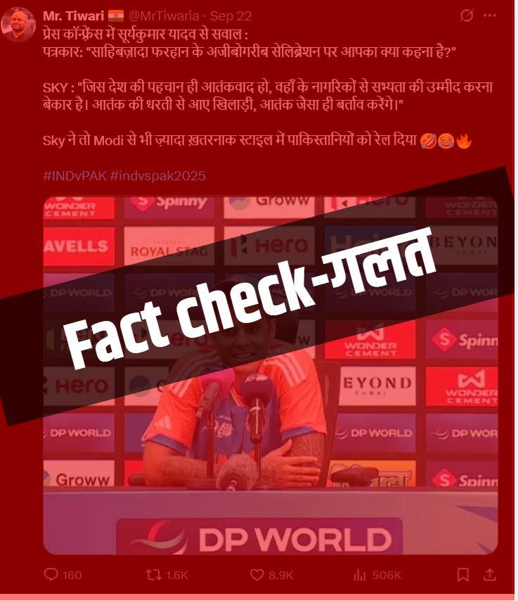 सबसे पहले वायरल ट्वीट के अकाउंट की जांच की गई। पता चला कि वो अकाउंट फर्जी था, वेरिफाइड नहीं था और पहले भी भ्रामक पोस्ट कर चुका था।इसके बाद सूर्यकुमार यादव की मैच के बाद की प्रेस कॉन्फ्रेंस का पूरा वीडियो देखा गया। नतीजा साफ निकला — पूरे वीडियो में सूर्या ने न तो फरहान का नाम लिया और न ही उनके सेलिब्रेशन पर कोई टिप्पणी की।इससे साबित होता है कि यह दावा पूरी तरह फर्जी है।