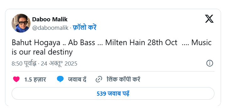(Additionally) उनके पिता और संगीतकार डब्बू मलिक ने एक रहस्यमयी पोस्ट शेयर किया, जिसमें उनके बेटे के बाहर जाने का संकेत मिला। (He wrote) “बहुत हो गया… अब बस। मिलते हैं 28 अक्टूबर… संगीत ही हमारी असली नियति है।”