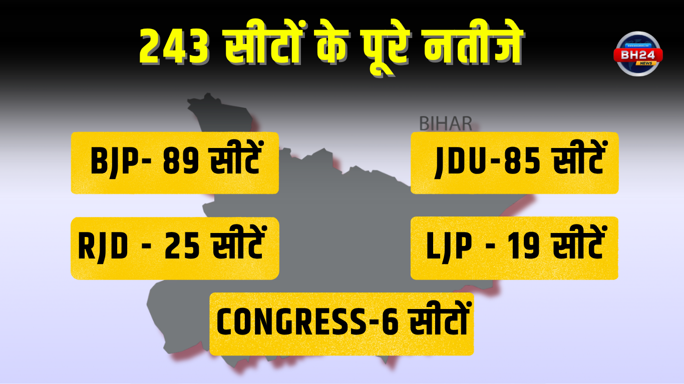 बिहार की सभी 243 सीटों की गिनती पूरी होने के बाद अब साफ दिख रहा है कि जनता ने इस बार एनडीए पर ही पूरा भरोसा जताया है। नतीजों में एनडीए को कुल 202 सीटें मिलीं, जिसमें बीजेपी को 89 सीटें, जेडीयू को 85 सीटें और एलजेपी (रामविलास) को 19 सीटें हासिल हुईं। इसके अलावा (furthermore) महागठबंधन का प्रदर्शन बहुत कमजोर रहा, जहां राजद सिर्फ 25 सीटें जीत पाई और कांग्रेस केवल 6 सीटों पर ही सिमट गई।