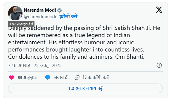 इसके अलावा (moreover), प्रधानमंत्री नरेंद्र मोदी ने भी सतीश शाह का निधन (Satish Shah Death) पर दुख व्यक्त किया। उन्होंने एक्स पर लिखा, “सतीश शाह जी के निधन से अत्यंत दुखी हूं। उनके सहज हास्य और उत्कृष्ट अभिनय ने अनगिनत लोगों के जीवन में हंसी और ऊर्जा भर दी।” साथ ही (along with this), पीएम मोदी ने उनके परिवार और प्रशंसकों के प्रति गहरी संवेदना भी व्यक्त की। इस बीच (meanwhile), उनके इस पोस्ट पर हजारों लोगों ने कमेंट करते हुए अभिनेता के योगदान को याद किया।